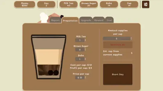 To sell boba tea, you need to make sure you have enough supplies! Before you open up the shop, you can change the amount of each ingredient used in your boba tea. You can restock your supplies per cup, but try not to spend all your money!
