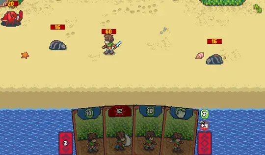 Drag attack cards onto enemy characters to deal damage, or drag defensive cards onto your character to add to your shield value. Each attack does damage equal to the attack value minus the character's current shield value. Shields drain by 1 each turn. You can also discard a card to make your next action more powerful!