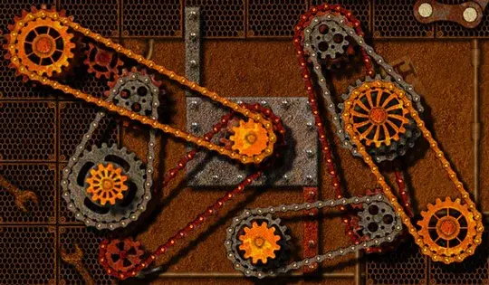 Link up all of the gears to get them turning. Click one gear and then another gear with your mouse to link them with a chain. You can only link gears of the same color, and can't overlap chains with gears of that color. Some gears have a green or in the middle which mean that they can be moved. Click to pick one up and drop it on an open red spoke, then link or connect it to another gear to get it turning.