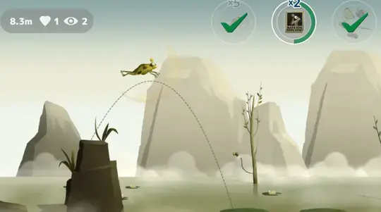 Swipe toward a flying insect to eat it. Different insects give you different abilities. Fireflies give you a better visual on how far you'll jump, blue dragonflies give you the ability to float (jump and tap again to use it), flies with hearts help you if you get stuck in the water, and butterflies give you the ability to fly (jump and tap again while in the air).