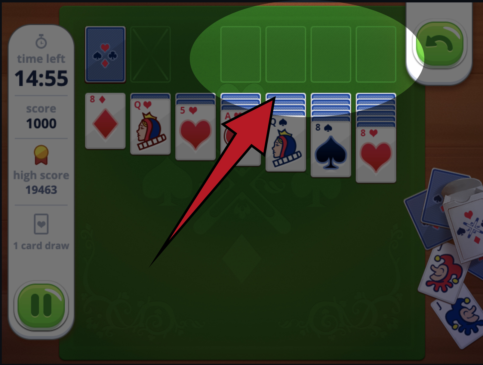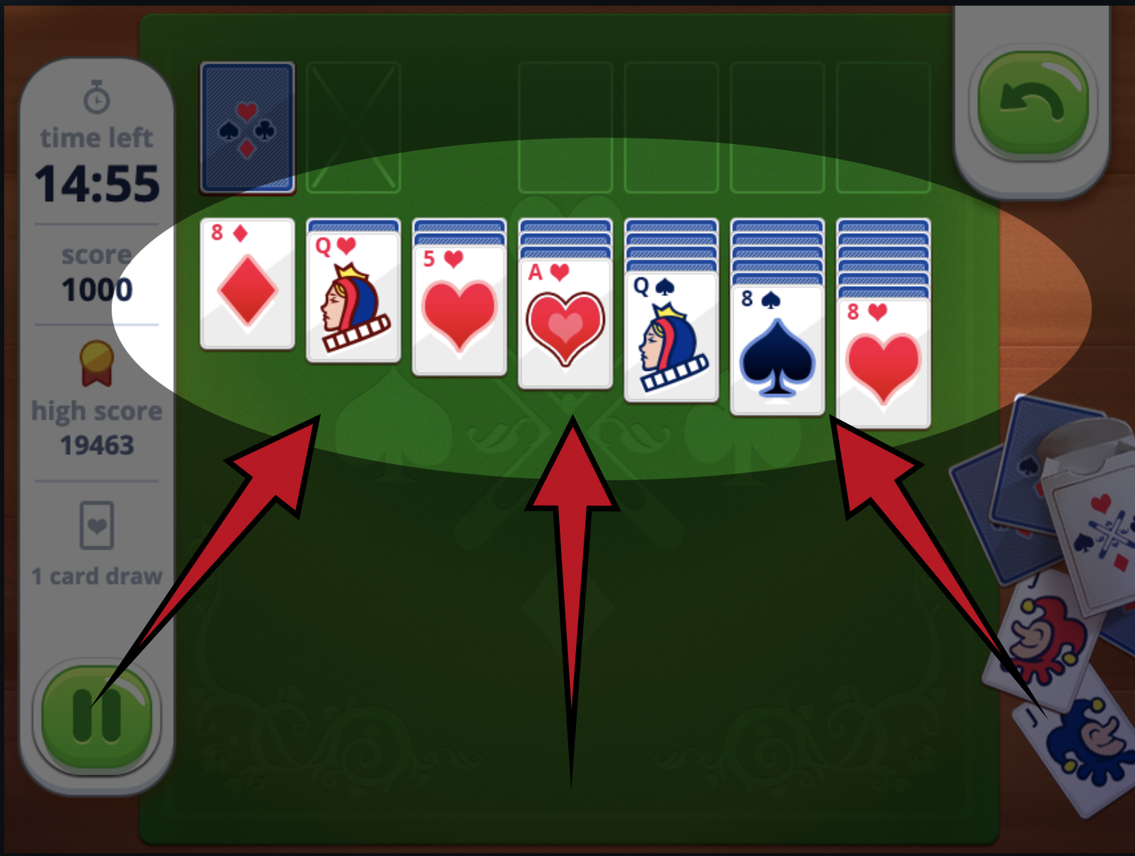 Think carefully. You may run into a few tough decisions throughout the game, notably when you have a few possible moves available to you. Let’s say there’s two red Queens on the table, which do you stack on top of the black King? It’s always best to go for the card that’s sitting on top of the most hidden cards.