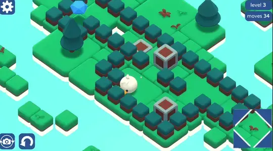Use as teclas de seta, WASD ou clique nas setas na tela para mover. Seu objetivo é empurrar as caixas na água para construir um caminho até a joia!