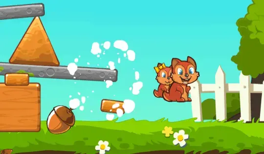 点击木块,将花栗鼠放在上面。点击屏幕左侧的黄色按钮,让花栗鼠开始咀嚼。让方块掉到坚果上,把它们打开!