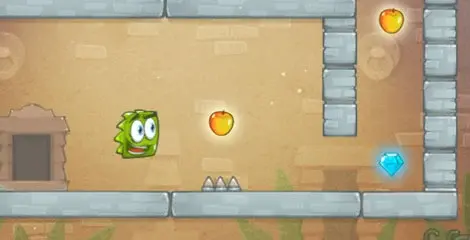 帮助绿色怪物吃芒果!单击以使怪物跳跃。小心尖刺,不要掉下来!收集钻石打开门,但不要在没有全部 3 个芒果的情况下通过!